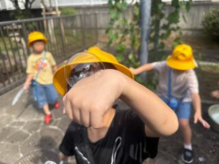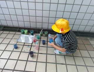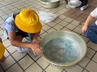 水遊びは、プールの時間に体育として行っているので、アサガオの色水遊びやシャボン玉遊びをしました。
