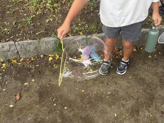 台所洗剤と水の他、グリセリンやPVA洗濯糊もまぜた特別なシャボン玉。大きくできました。
