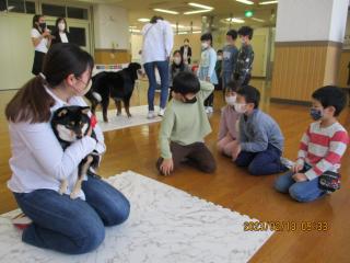 動物介在プログラムで犬と触れ合いました。かわいかったですね。
