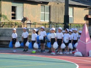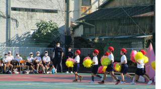 1年生の運動会デビュー!!「やってみよう★あいうえおんがく」です。2組の入場です。