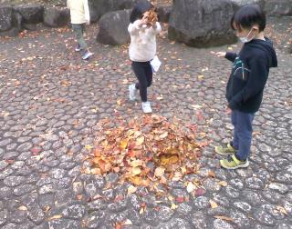 秋を探して、ポケットパークで落ち葉を集めて遊びました。