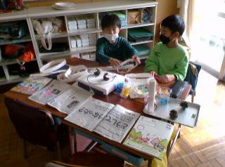 どんぐりやまつぼっくりを使った秋遊びの準備をしています。