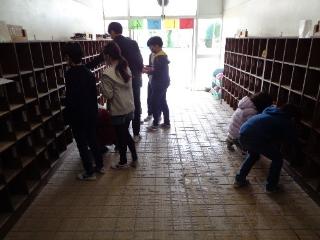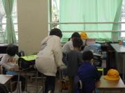 子供たちは1年生に元気に挨拶をした後、名札の付け方やランドセルのしまい方について優しく伝えています。仕事が終わった後は、「こうすると上手くいったよ。」と様子を引き継いでいました。