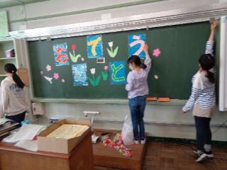 始業式の前日、他の学年より一足先に登校して、最高学年として入学式の準備を行いました。机や椅子を運んだり、1年生教室の装飾をしたりしました。5年生の頃と同じように、学年全体で協力して前向きに仕事に取り組む様子が見られました。この1年間、東一小の代表として、活躍する姿を期待しています。