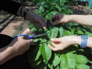 理科に関することですが、今6年生の花壇ではジャガイモを育てています。ご存じでしょうか。ジャガイモの葉っぱは、日光に当たるために近くの葉っぱをよけて360度全体に広がります。それほど、日光の重要性が高いのかもしれません。そこで。実験をします。実験のめあては、「植物の葉に日光が当たると、成長に必要なデンプンができるのだろうか」です。