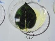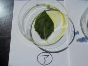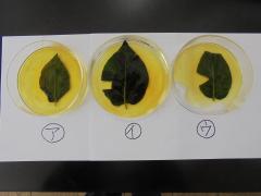 今回は前回の実験結果を載せます。実験の手順としましては、葉っぱを湯で煮てから、水で柔らかくします。その後、ヨウ素液につけて反応を調べます。↑