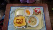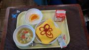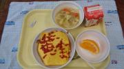 本日の給食では、お絵描きオムライスが出ました。一人一人に配られたケチャップで、オムライスに自由に絵が描けるという献立メニューでした。