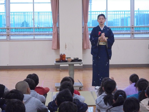 茶道の歴史や作法を講師から教えていただき、子供たちは「そうだったんだ。」「なるほど。」と楽しみながら聞いていました。