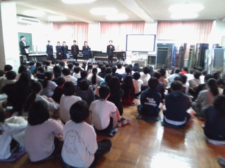 東中学校の先輩が来校し、6年生に向けての中学校説明会を開いてくれました。中学校ではどのような学習ができるのか、部活動があるのかなど興味深々な様子で説明を聞いていました。先輩が堂々と話している姿にも刺激を受けたようです。