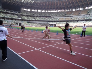 国立競技場特別ツアーに行ってきました。オリンピックやパラリンピック、世界陸上などで選手が活躍したグラウンドを使って、実際に走る体験をさせていただきました。観戦で訪れたことがあっても普段なかなか入れない場所に行くことができて貴重な思い出ができました。