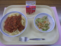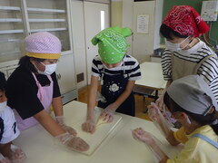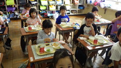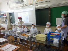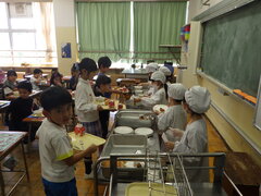 1年生が給食着を着て、初めての配膳に挑戦しました。トングをもって、笑顔でお友達にくばっていました。もらう子供たちは、お皿をしっかり持って、落とさないように慎重に歩く姿が、とてもかわいらしかったです。