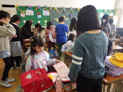 2年生が1年生の部屋を訪問しました。手には、大事に育てて最後にとった「あさがおの種」が入ったバッグを持っています。「早く学校になれてね」「学校はたのしいよ」など、一人一人が1年生に声をかけて、プレゼントしていました。2年生がすごくお兄さん・お姉さんに見えました。