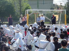 明日は雨予報なので、今日が校庭で練習できる最終日となりました。体操着は洗濯中なので私服でしたが、6年生は気にすることなく演じる姿に気合が感じられました。4年生はついに笠に花と鈴が付き、花笠が完成。どの学年も本番が楽しみです。