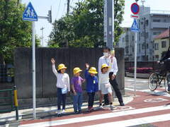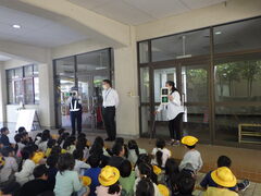 1年生が歩行訓練を行い、教育委員会の方のお話を聞いた後、実際に道路を歩いて、横断歩道を渡る練習をしました。左右をよく確認し、しっかり手を挙げてわたることを学びました。これからも安全に気を付けて登下校していってほしいです。