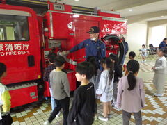 今日はあいにくの雨で、消防写生会はピロティでの見学になりました。消防士さんの話をじっくり聞きながら、間近で消防車を見られて、こどもたちはわくわくしているようでした。教室に戻り、写真を見ながら絵を描きました。本物のように大きくのびのびを描くことができ、まるで消防車が絵からとびだしてきそうでした。