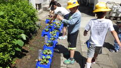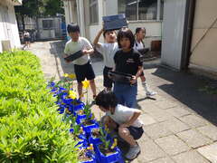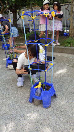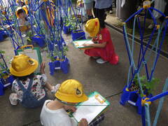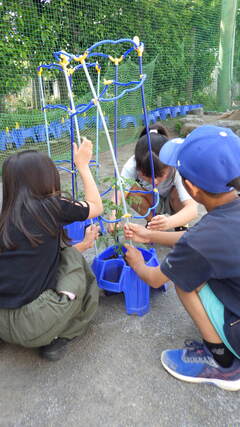 生活科で夏野菜を育てます。自分の好きな野菜を選んで、苗を植えました。今日は、今後の成長のために支柱を立てたり、写真で記録をとったりしました。これから、野菜の毎日の変化に気づき、大切に育てていってほしいと思います。