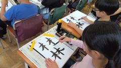 4年生 毛筆の様子です。「すー、とんっ」と声を出しながら、プリントになぞり書きをして、字形を確かめました。練習を経て「林」の文字を丁寧に書くことができました。