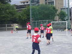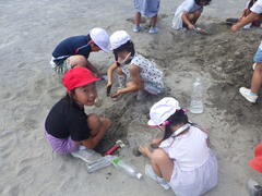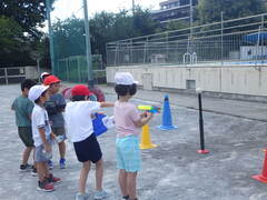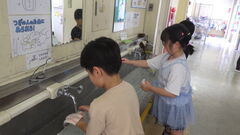 1年生が校庭で、自分たちで考えた水遊びをしていました。砂場で川づくり、道具を使って的あて、色水つくり・・・。水の心地よさを感じながら、大はしゃぎ。笑顔がはじけ、夏とのふれあいを思いきり楽しんでいました。