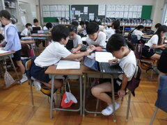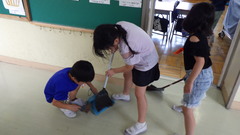 いよいよ明日は1学期最終日です。1学期使った教室の大掃除をしました。机の上、中、椅子、ロッカーの中をきれいに水ぶきしました。手の大きさにぞうきんを折って拭くと、きれいになることを発見しました。気持ちよく夏休みを迎えられそうです。