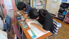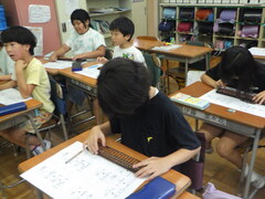 そろばんの練習をしました。3年生の時に初めてそろばんに触れたときは、緊張した面持ちでしたが、2回目とあって楽しく学ぶことができました。そろばん塾に通っている子もいて、さすがの指使いでお手本になっていました。これからも身近にある実用的な計算器具として伝えていけたらいいなと思いました。