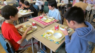 班での給食がスタートしました。これまでの前向きの形から、グループごとに机を囲み、友達と顔を合わせて食べる活動が戻ってきました。こどもたちは、配膳や片付けの役割を協力して行いながら、楽しく会話を弾ませています。今後も、安全面や衛生面に配慮しながら、充実した給食の時間となるよう指導してまいります。