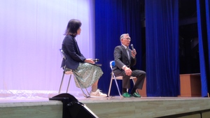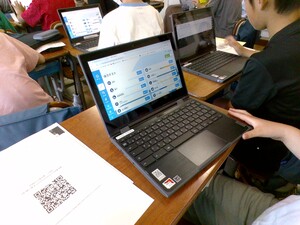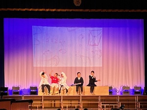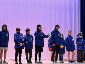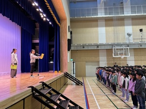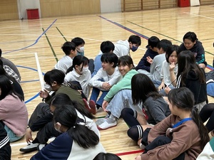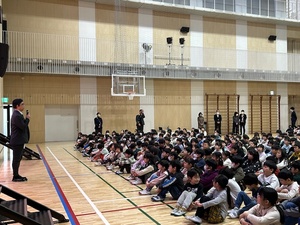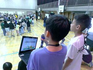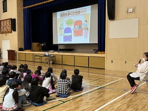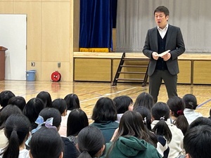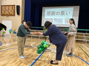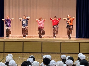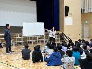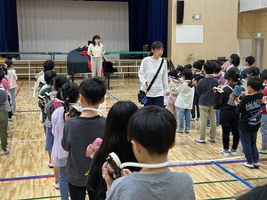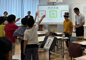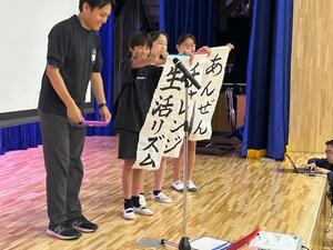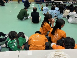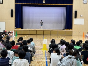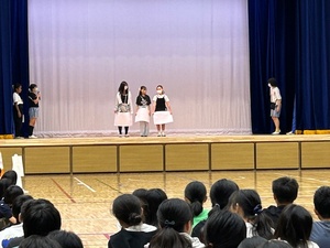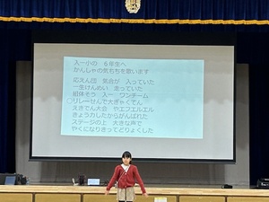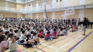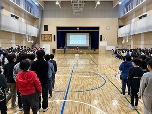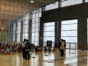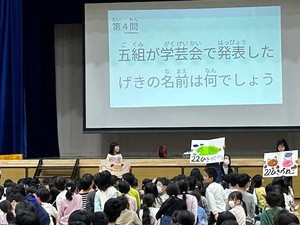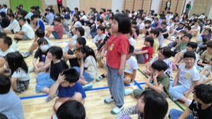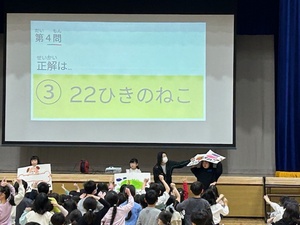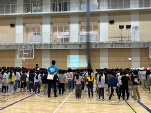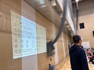 集会委員会による児童集会が体育館で行われていました。じゃんけん列車のBGMにタイブレットを活用しています。いろいろな場面で必要な時に必要な使い方ができるよう進めています。