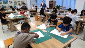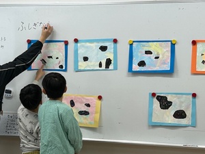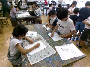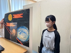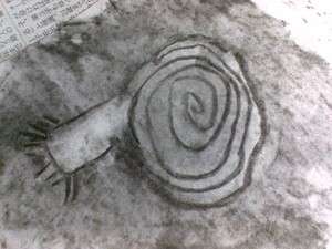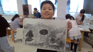 水墨画のような絵をかいていた4年生。木炭をつかって絵をかくためのイメージづくりをしているようです。「アンモナイトのようなものをかいたよ」と見せてくれました。濃淡を生かして雰囲気のある絵が仕上がっています。