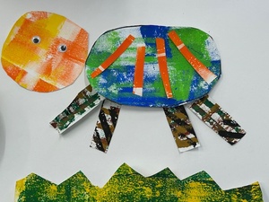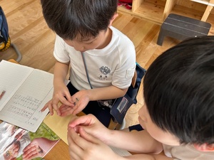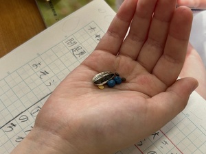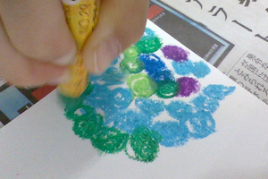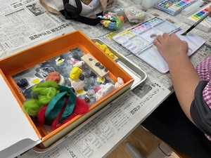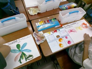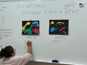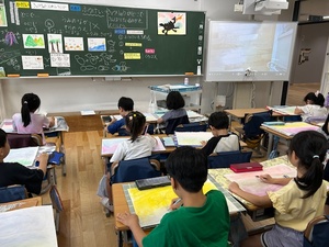 一昨日水墨画のように描いていたアンモナイトの絵とは真逆に、アジサイの色をクレヨンでいろどりよく描いていた一年生。すてきな色合いに注目しました。この絵にカタツムリさんがお散歩する様子を描くそうです。仕上がりが楽しみです。