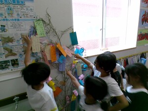 七夕飾りを見つけました。1・2年生が願い事を書いた短冊や飾りつけをしたそうです。数年前は「コロナがなくなりますように…」と書いている子がたくさんいましたが、今年は将来の夢など夢のあることばがたくさん並んでいました。みんなの夢がかないますように。