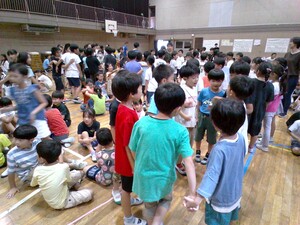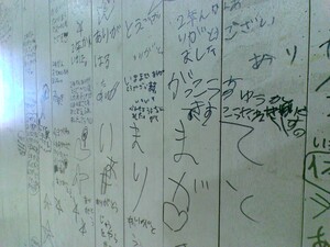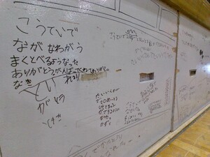今日で一学期の修了です。創立100周年以降49年間使われ続けた体育館ともお別れです。今日はこの体育館で終業式を行い、こどもたちの元気な歌声が響きわたりました。体育館の壁面には、こどもたちによるお別れのメッセージがあふれています。卒業生の分まで感謝の気持ちを表していました。