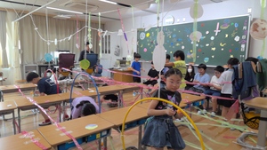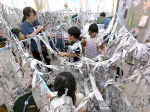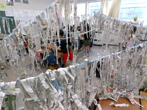 今年も2年生が図工で「つないでつるして」の活動を行っていました。新聞紙を長細く切り、教室に張り巡らせたスズランテープにつないだりつるしたりしています。どこにこどもたちがいるのか分からなくなるくらいダイナミックな活動に没頭していました。とても楽しそうでした。
