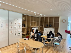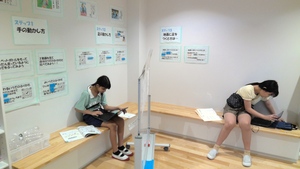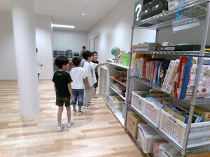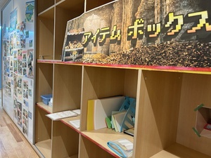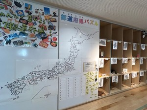 昨日は2階のフリースペースをご紹介しましたが、今日は3階です。こちらは収納箱を生かし、47都道府県にまつわるグッズを手に入れたこどもたちが自由に展示しながら学べるコーナーになっています。こちらの写真は○○ちゃんと○○製糸場にまつわるものですが、何県か分かりますか?ぜひどの学年にも見てもらい、各都道府県名と特徴を知るきっかけにしてほしいですね。
