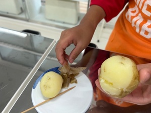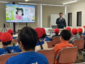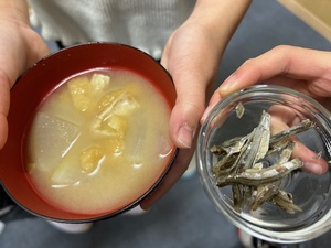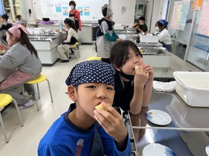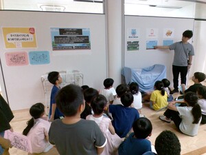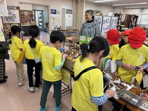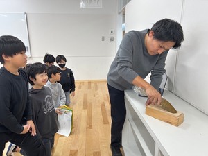 先生が何かを真剣に削っています。削る前にはこどもたちが手触りや香りを確かめていました。そのものは「かつお節」です。水産加工物に関心をもたせ、日本の水産業について考える意欲をもたせようと準備していました。削っている様子を心配そうに見つめるこどもたち。削りあがったかつお節の味も試していました。ふだん口にするかつお節よりも細かく、香りも強かったようです。