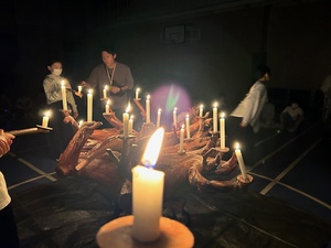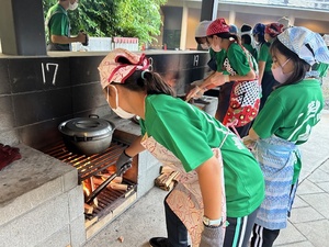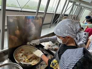 今日のとうぶ休養村は一日雨の予報です。朝は赤松小学校と交流のゲームを楽しみ、お互いのことを知るきっかけとなりました。いりいちは休養村でカレー作りをしています。お昼はこのカレーをいただきます。