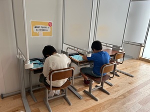 みなさんの集中できる場所はどんなところですか?静かな部屋でも広すぎず、狭すぎず、その感覚は人それぞれですね。三角形や直角について学習している2年生。ある子たちはは個別ブースを選んで算数の問題に取り組んでいました。分からなくなったり、心配になったりしたら先生に相談しています。