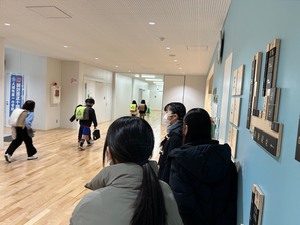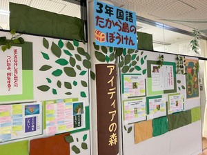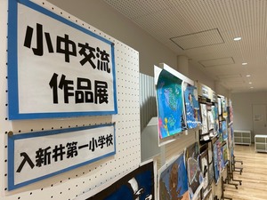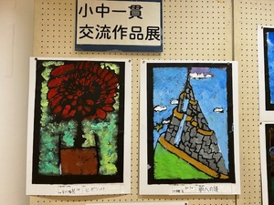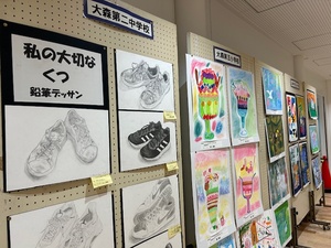 図書室前に近隣の小中学校(大森第二中学校区)の図工・美術の作品交流展示を行っています。本校卒業生の作品も見ることができます。中学生ともなると格段に写実性が高まる様子がうかがえます。このような地道な小中の交流を毎年続けています。
