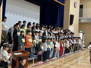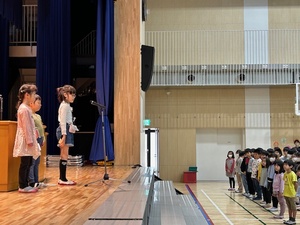 今日は集会があったり、なかよし班活動があったり、こども同士が交流の機会がもてる時間がたくさんありました。朝の児童集会では、集会委員会の進行で「猛獣狩りへ行こうよ」が行われていました。先生たちにも声をかけて仲良く取り組めました。