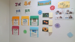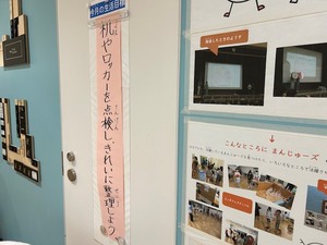 フリースペースの紹介、最後の4階です。スポーツフェスタ開催前後は「ソーラン節」に関係するクイズや体感できるスペースでしたが、今は6年の国語の学習に関係する環境が作られています。日本語にある接続詞をほぼすべて掲示し、それらを積極的に使えるようにする工夫や写真等から想像を膨らませるコーナーなど今のこどもたちにも言葉に関心をもってもらい、国語を楽しめるよう工夫しています。