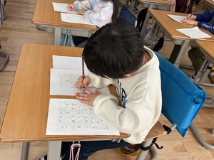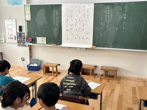 今日は1年生が初めての「書初め大会」を行っていました。黒板に掲示されたお手本や気を付けることに心を配りながら、とても静かに集中して一文字一文字を丁寧に書いていました。一文字一文字にはにこどもたち一人一人の魂が込められているようです。これからもっとたくさんのそして豊かな言葉や漢字を学んでいけるといいですね。