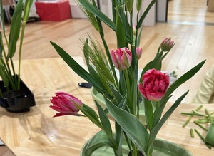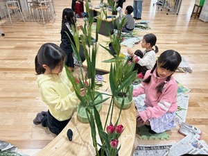 3年生以上がクラブ活動をしているうらで、華道教室に参加している下学年のみなさんがいました。地域のお花の先生からいけ方を聞いて、春の花、チューリップやスターチスを生けていました。お花の位置と全体のバランスを見ながら個性光る作品に仕上げていました。