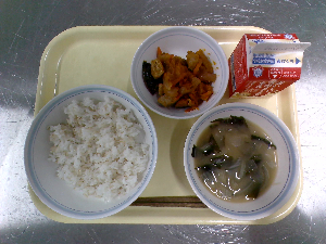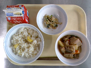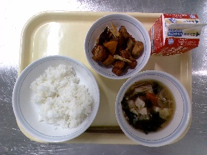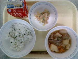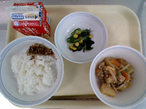 【今日の給食】牛乳 わかめごはん 肉じゃが ツナ酢和え