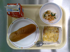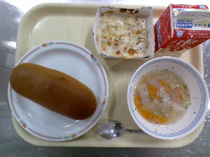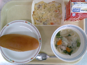 【今日の給食】牛乳 ミルクパン マカロニグラタン 野菜スープ