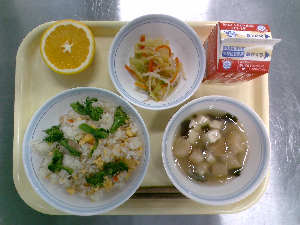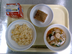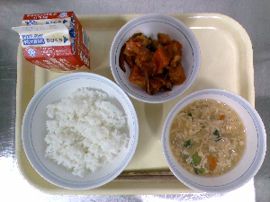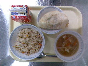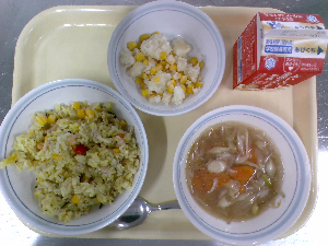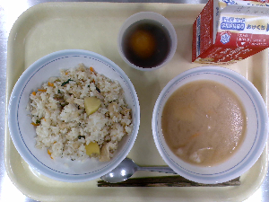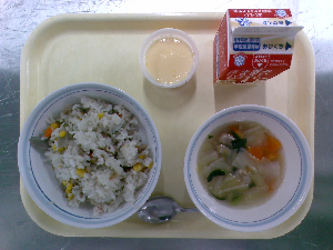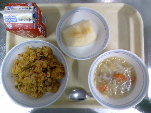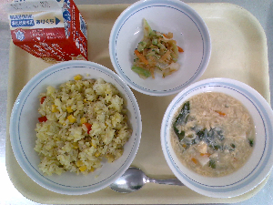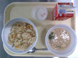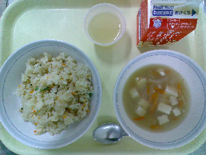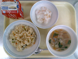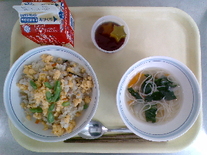 【今日の給食】牛乳 チャーハン 中華スープ りんごゼリー