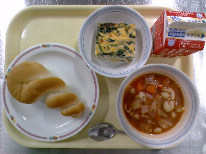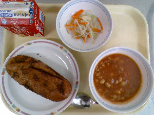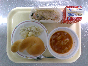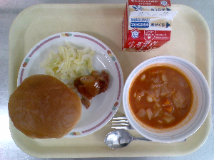 ひとこと:今日の主菜は、ボルシチです。給食では、ビーツの代わりにトマトピューレなどを使って、ボルシチに近い味と色を作りました。たくさんの野菜と肉が入って、寒い季節にぴったりのスープです。