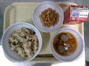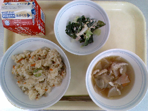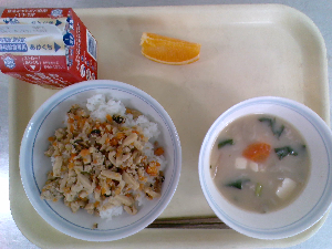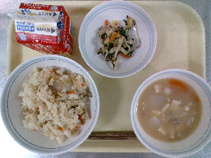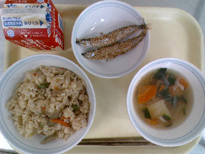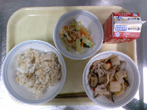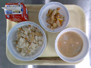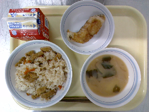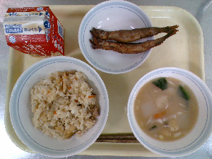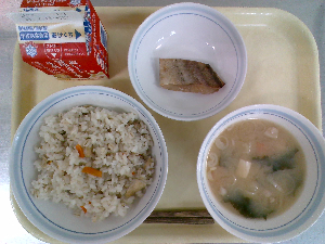 献立:炊き込みご飯 牛乳 魚のごまみそ焼き のっぺい汁 くだもの