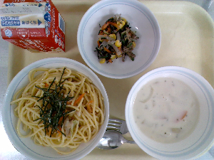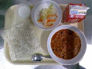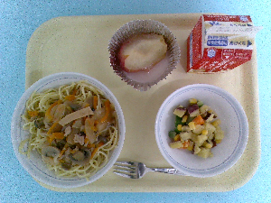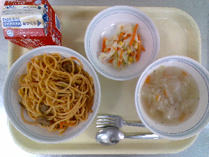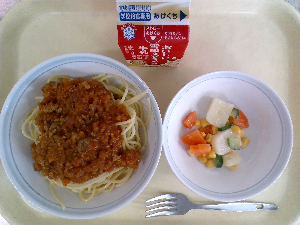 【今日の給食】牛乳 スパゲッティミートソース ポテト入りサラダ