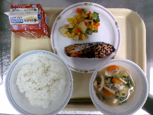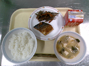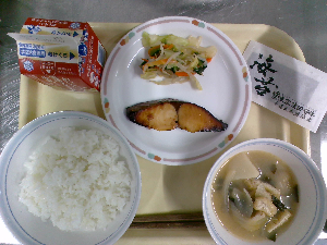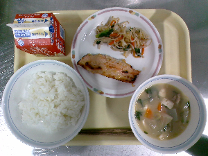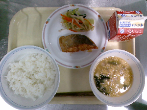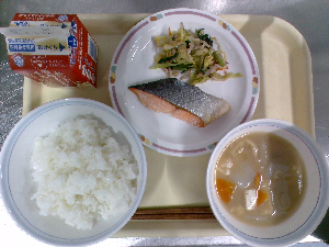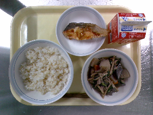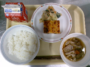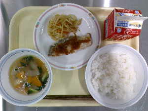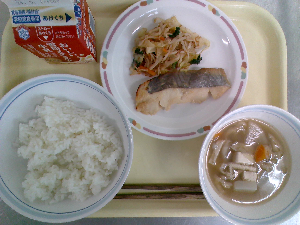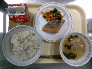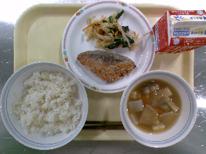 【今日の給食】牛乳 ごはん 魚の西京焼き えのき入りおひたし けんちん汁