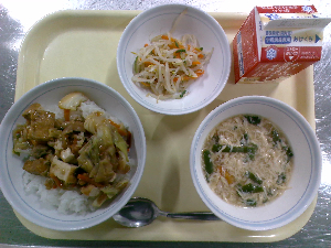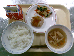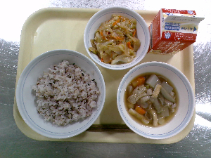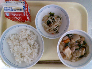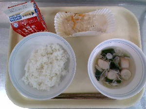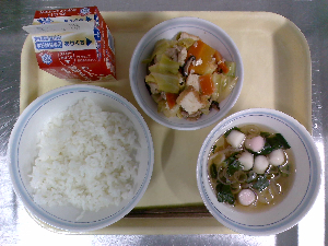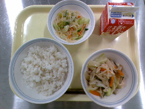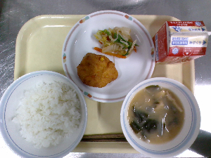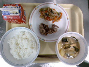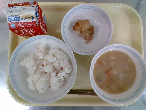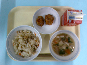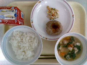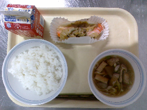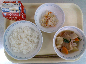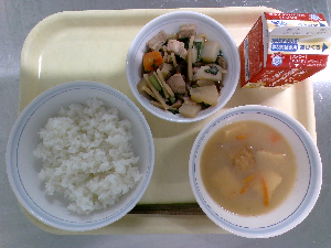 【今日の給食】牛乳 ごはん 鶏れんこんつくね 白菜の梅和え ぬっぺ汁