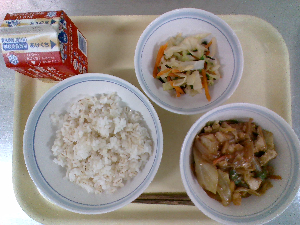 【今日の給食】牛乳 麦ごはん 鶏と野菜のみそ炒め 昆布和え