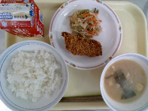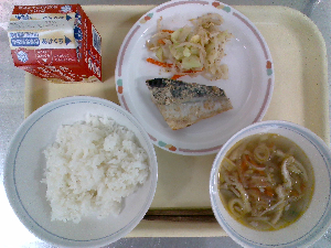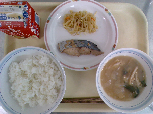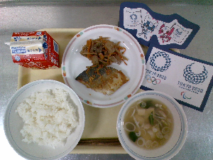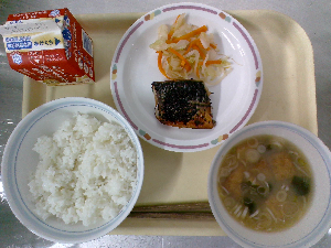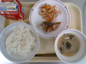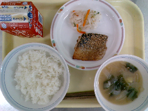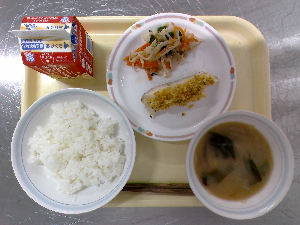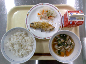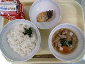 【今日の給食】牛乳、ごはん、魚のごまみそ焼き、ごま酢和え、沢煮わん